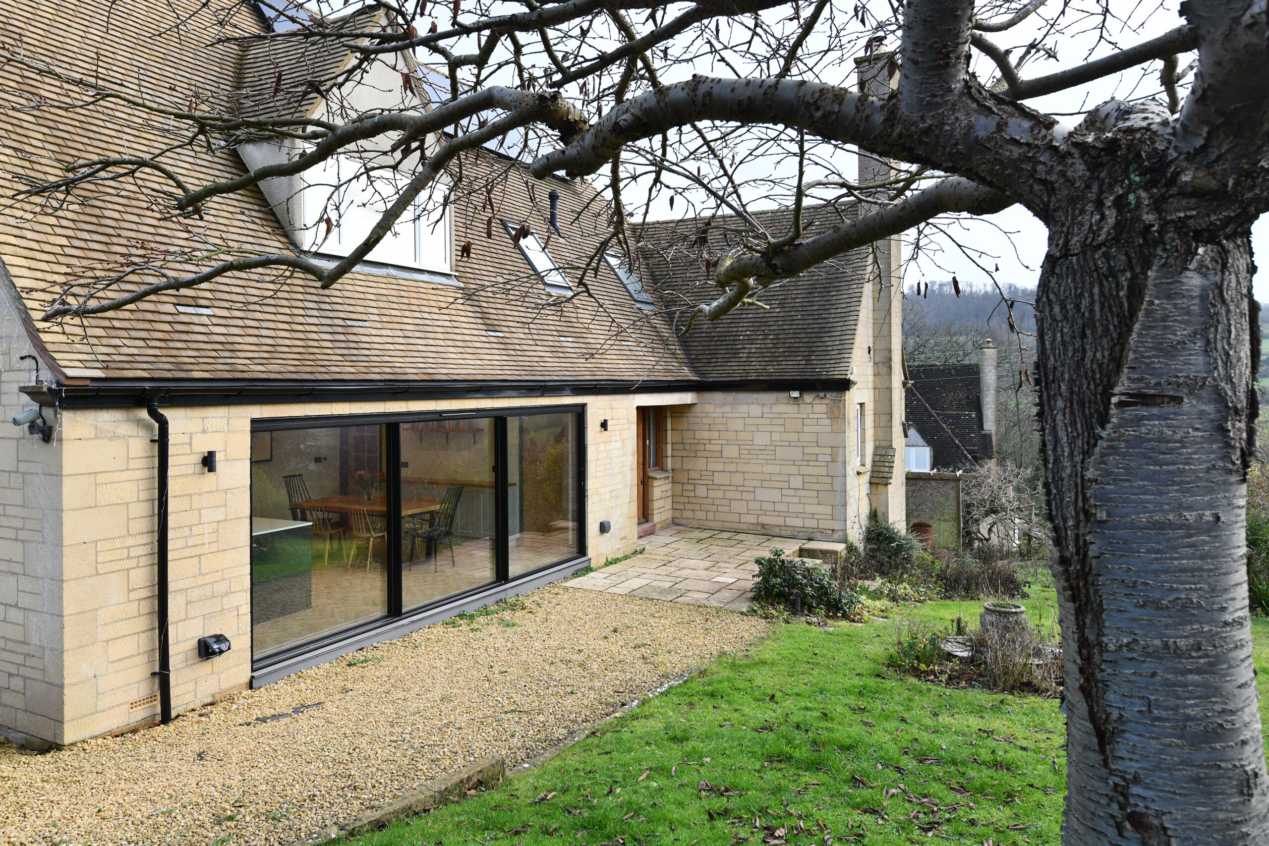 Large three-panel sliding doors form a key feature of the design, opening directly onto the garden and allowing natural light to flow through the kitchen and dining area. This connection creates a strong sense of space and openness throughout.
