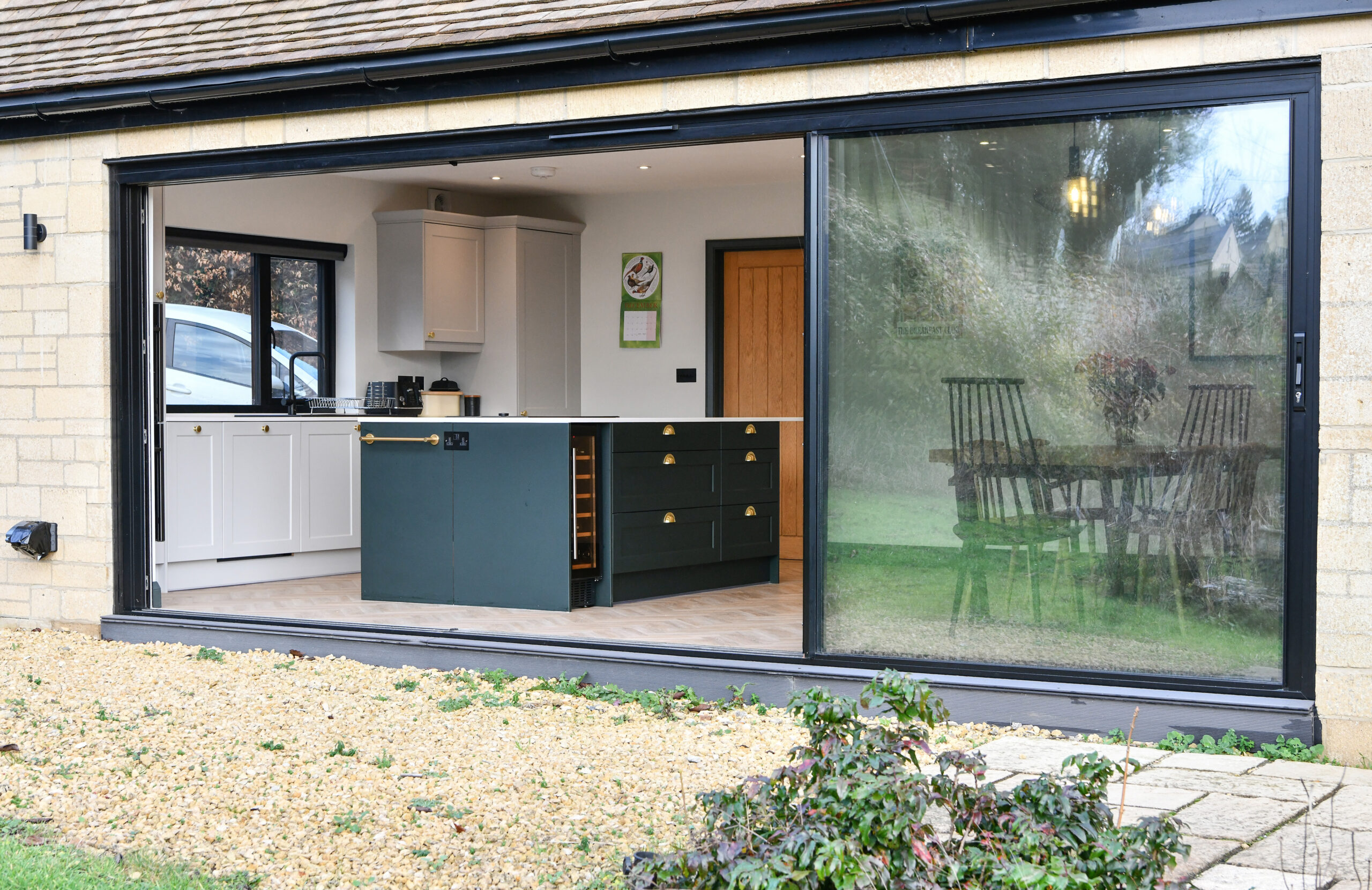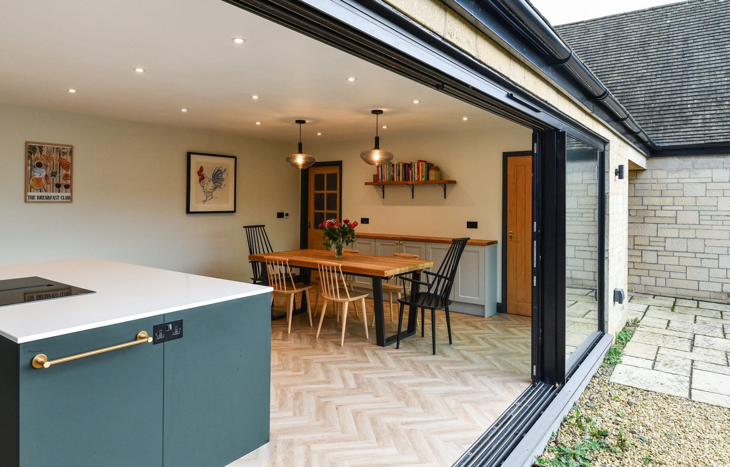 Large three-panel sliding doors form a key feature of the design, opening directly onto the garden and allowing natural light to flow through the kitchen and dining area. This connection creates a strong sense of space and openness throughout.
